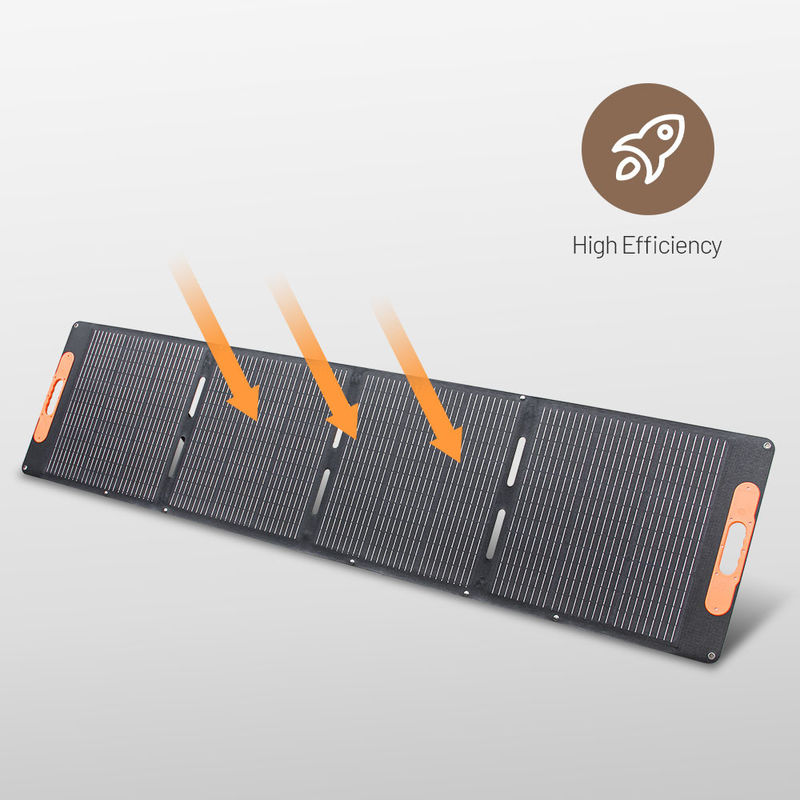 Panel surya lipat ini dilengkapi dengan sel surya efisiensi tinggi yang dapat mengubah hingga 23% energi matahari menjadi tenaga yang dapat digunakan.Mereka juga dibangun dengan bahan yang tahan lama dan tahan cuaca, membuat mereka cocok untuk digunakan di lingkungan luar yang keras.