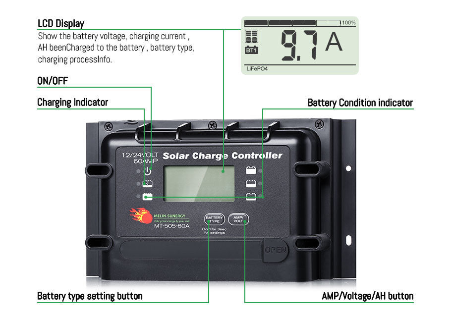 | Input Daya Surya Maks. | 1140W@sistem 12V, 2280W @24V |